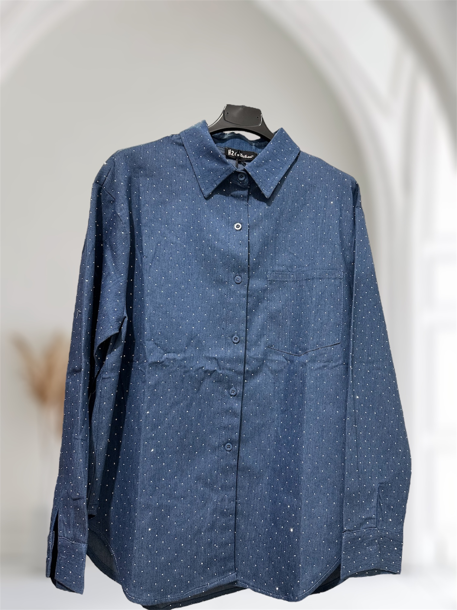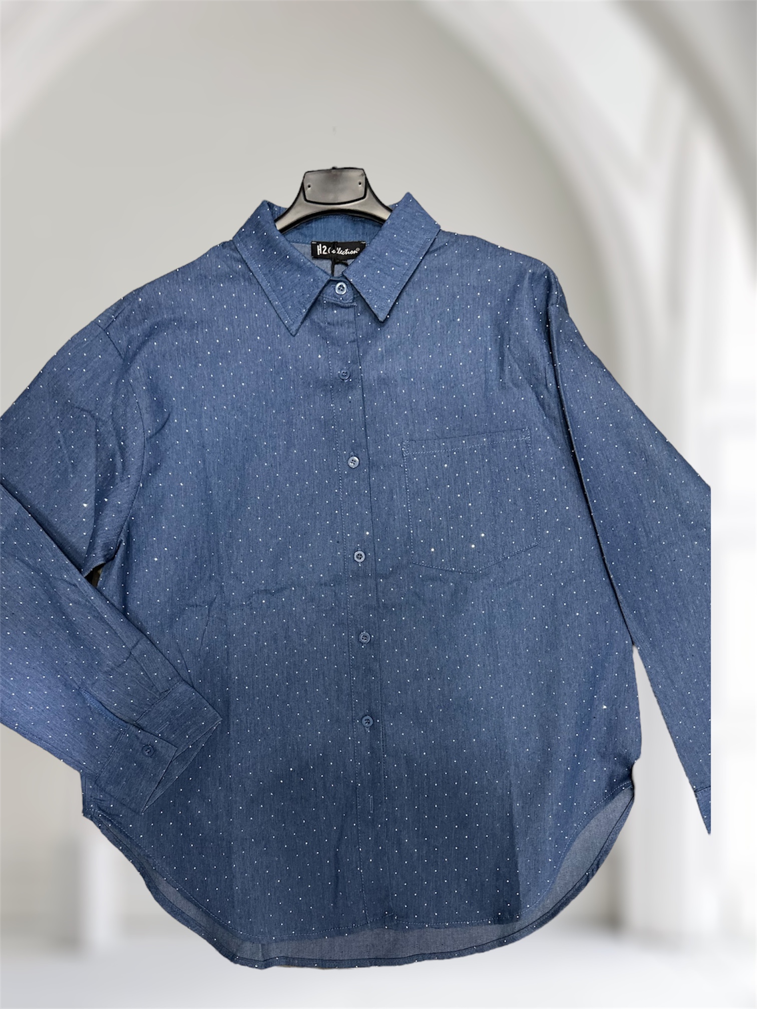 Shirt shine woman in cotone, con strass, colore denim chiusura bottoncini, vestibilità over, bottoncini nella manica